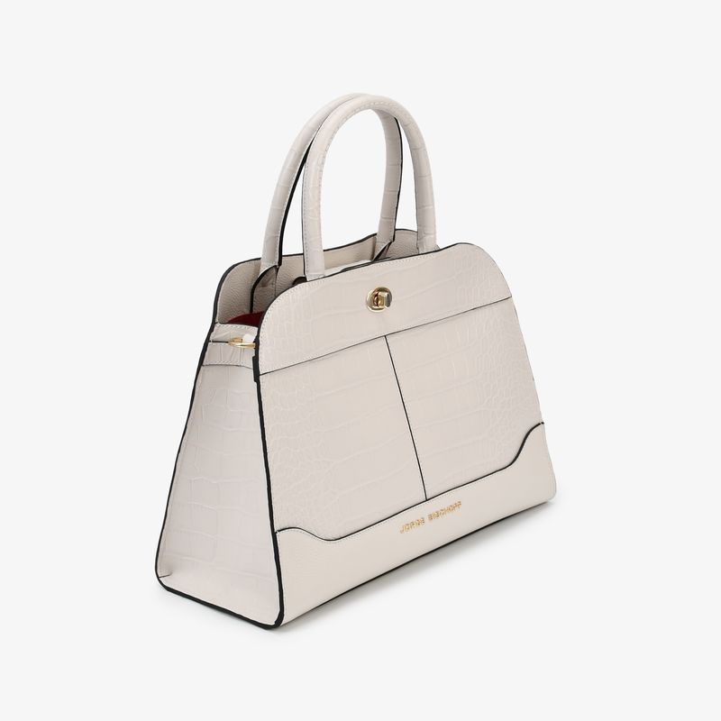 O modelo possui alça de mão, alça transversal ajustável e removível. Na parte frontal conta com detalhe da placa de metal na cor dourado com o nome da marca JORGE BISCHOFF. Na parte externa essa bolsa conta com quatro compartimentos de tamanhos deiferentes, sendo dois deles com fechamento por zíper. Fechamento principal por torniquete.